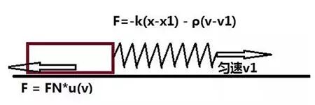 在一些情况下(比如之前解释的金属摩擦),摩擦系数并不是同速度无关,而是关于速度的函数,并且是关于速度递减的。为了分析这个问题,我们使用如下图的模型。